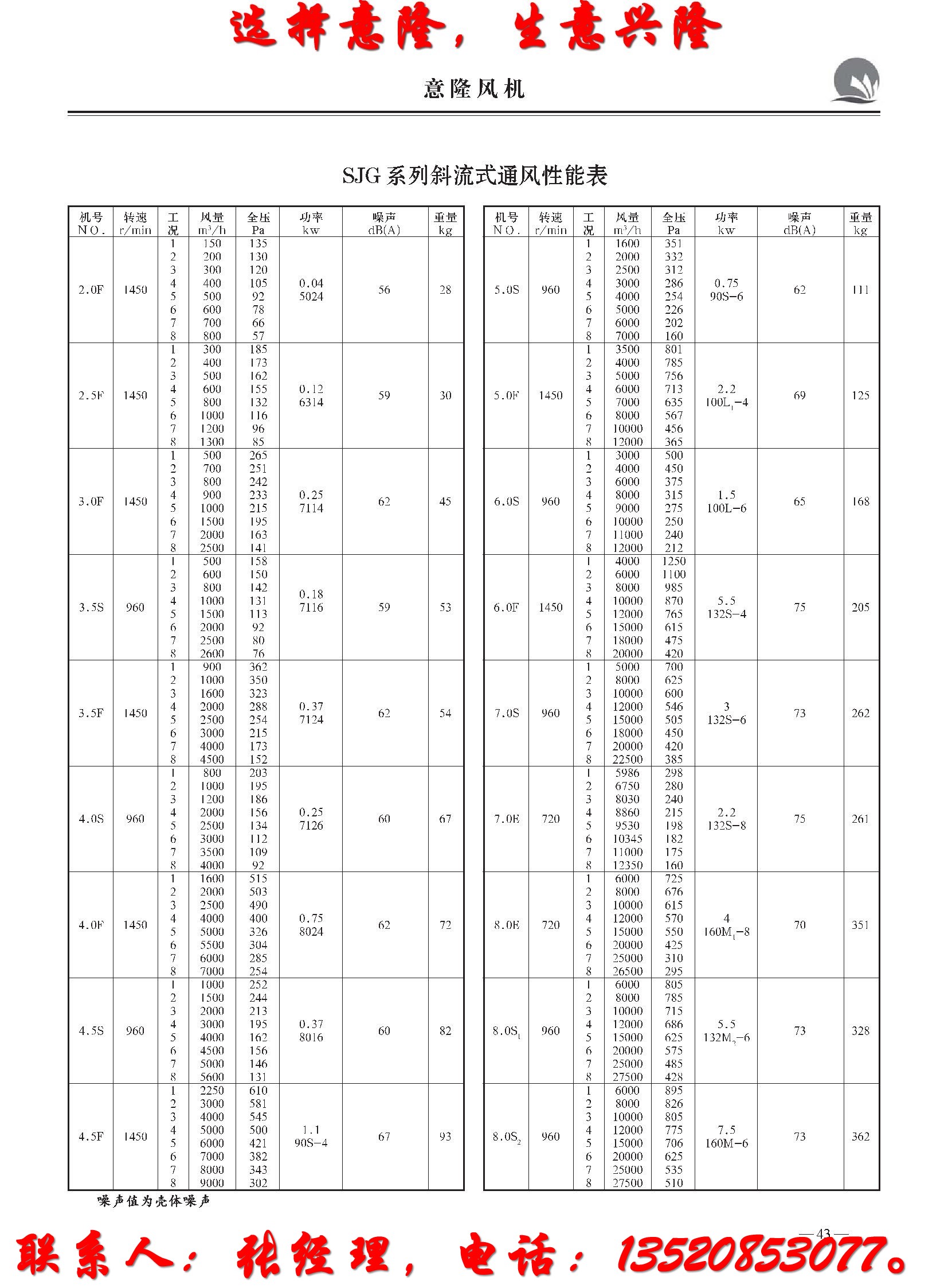 SJG型系列斜流式管道风机是一种新型的机型,其叶轮为轴流式风机的变形,气流沿叶片中心为散射形,并向气流方向倾斜。其特点:在同机号相比之下,流量大于离心式风机;全压高于轴流式风机;体积小于离心式风机,具有高效运行区宽广、噪声低、占地少、安装方便等优点。该风机不影响管道布置和管道走和走向,最适宜于为直管道加压和送排风。对于空间狭小的机房,尤其显示出它的结构紧凑的优越性。 SJG型系列产品广泛应用的工矿企业、宾馆、饭店、博物馆、体育馆、高层建筑等通风换气场所。替代低压离心风机,节省投资和占地,简化设计、方便安装,在轴流风机压力你,满足不了管道通风机的场合,SJG系列风机尤显神威,本风机如用玻璃钢制造可输送出腐蚀性气体,如接防爆电朵可输送易燃、易爆气体;被送气体温度在80℃以下; 斜流式管道风机与离心风机和轴流式风机比较具有独特的直线型型结构和介于两者之间的空气动力特性参数。